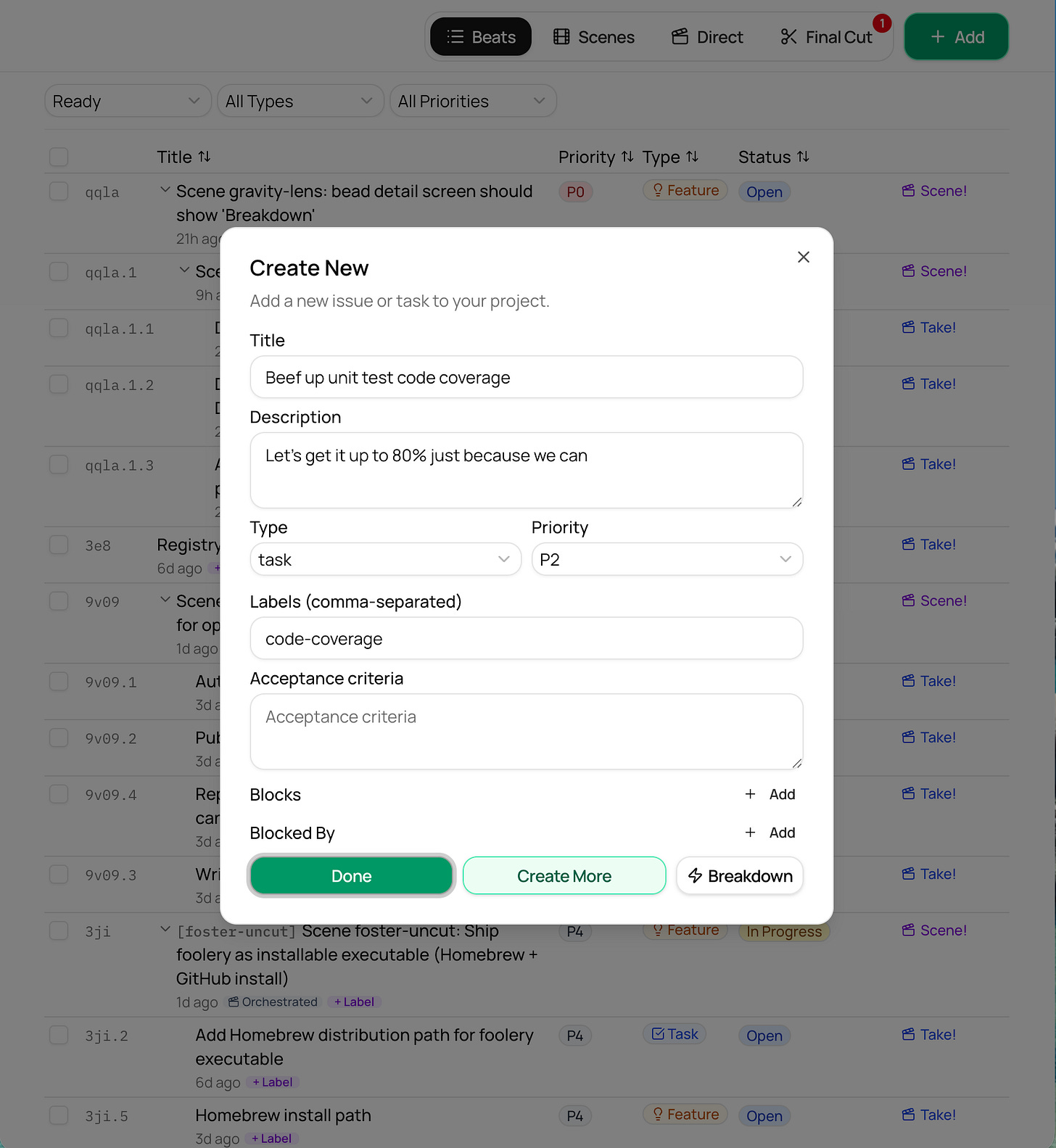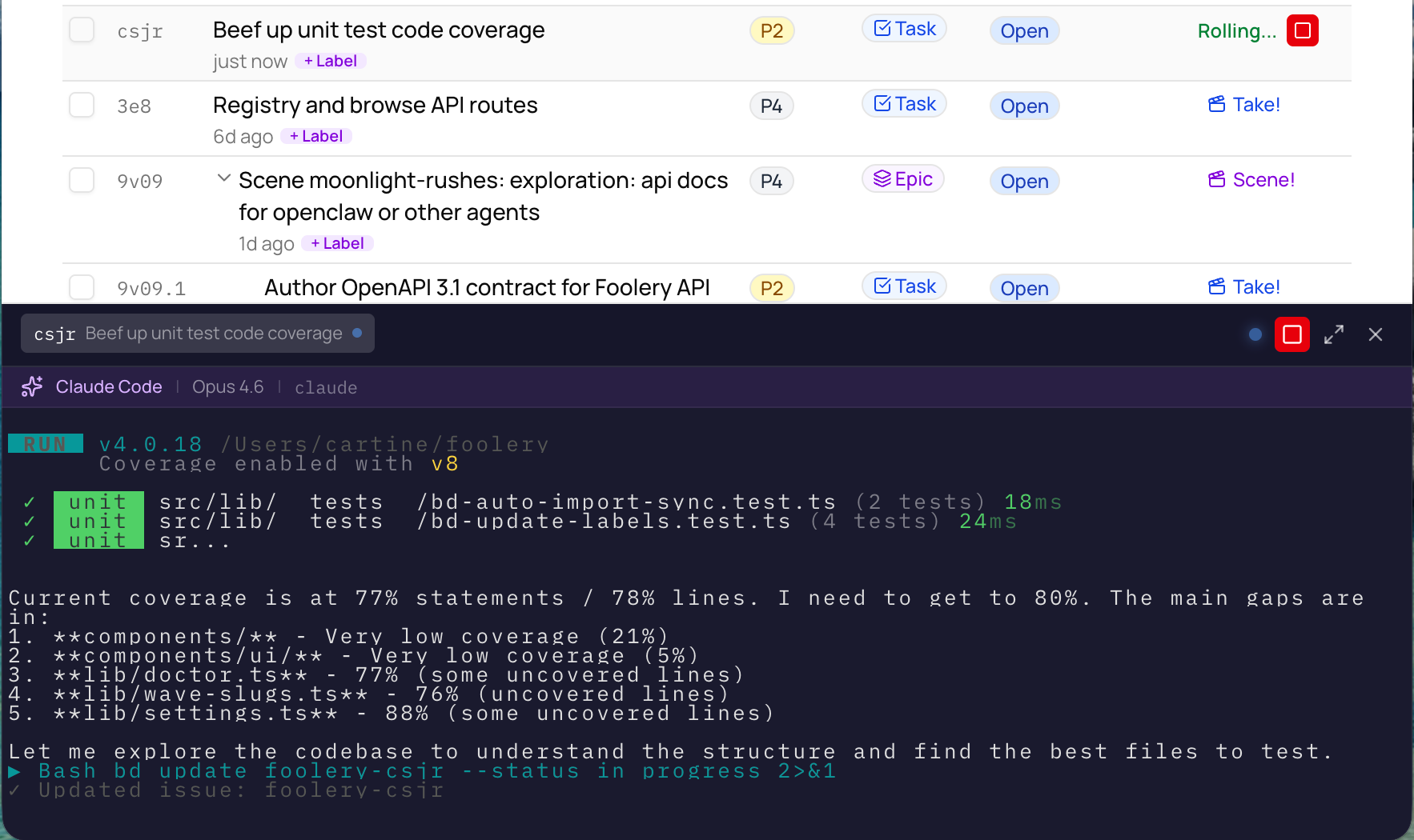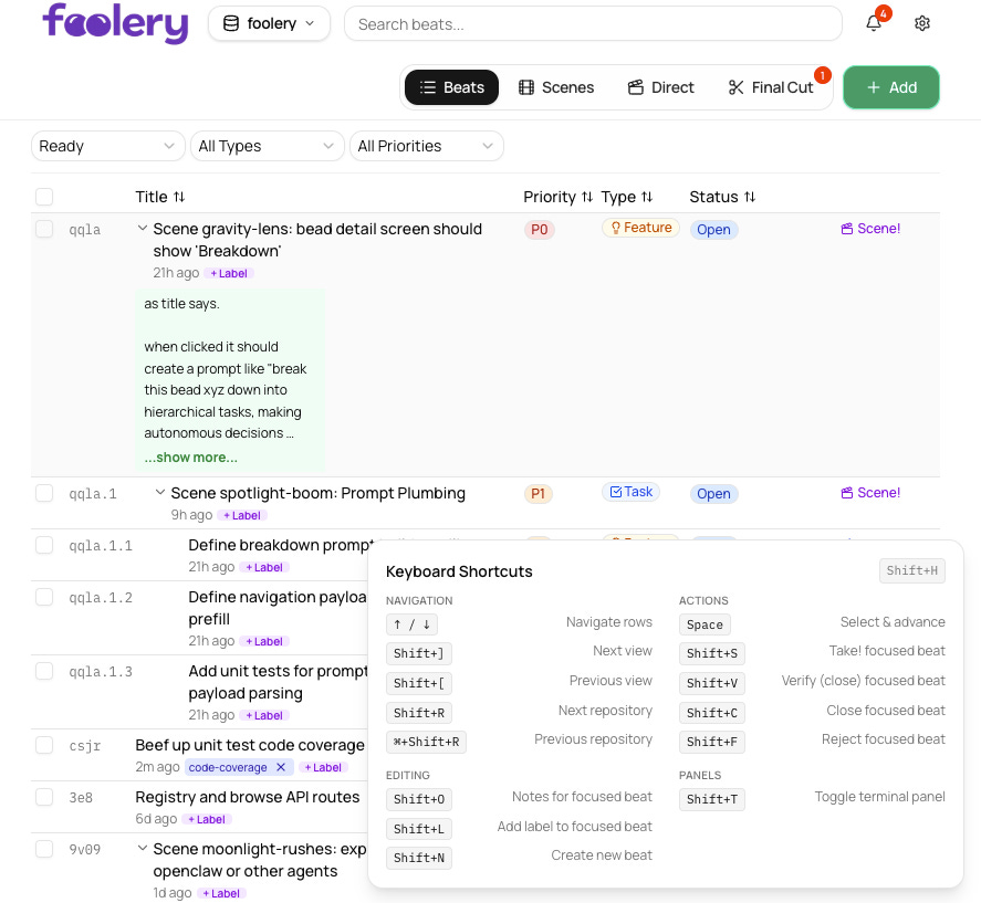 curl -fsSL https://raw.githubusercontent.com/acartine/foolery/main/scripts/install.sh | bashKeep it open while you use the coding agent of your choice. Discipline yourself to keep the agent focused, but blast all your harebrained ideas into Foolery. You’re gonna love it. And if not, well, it was fucking free.