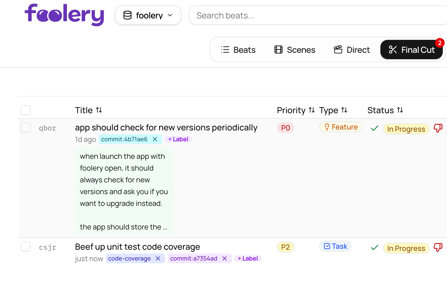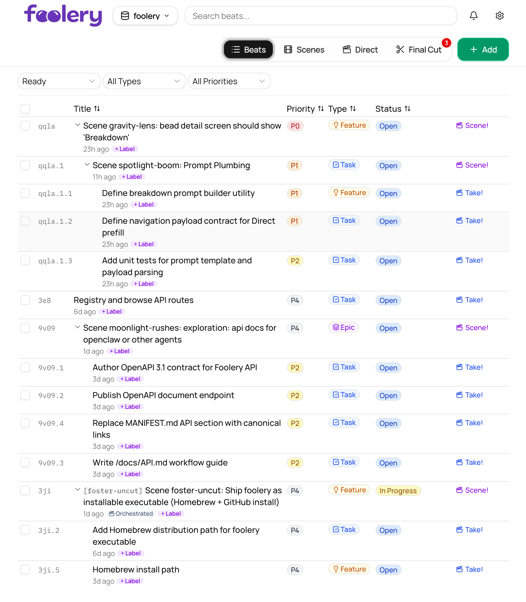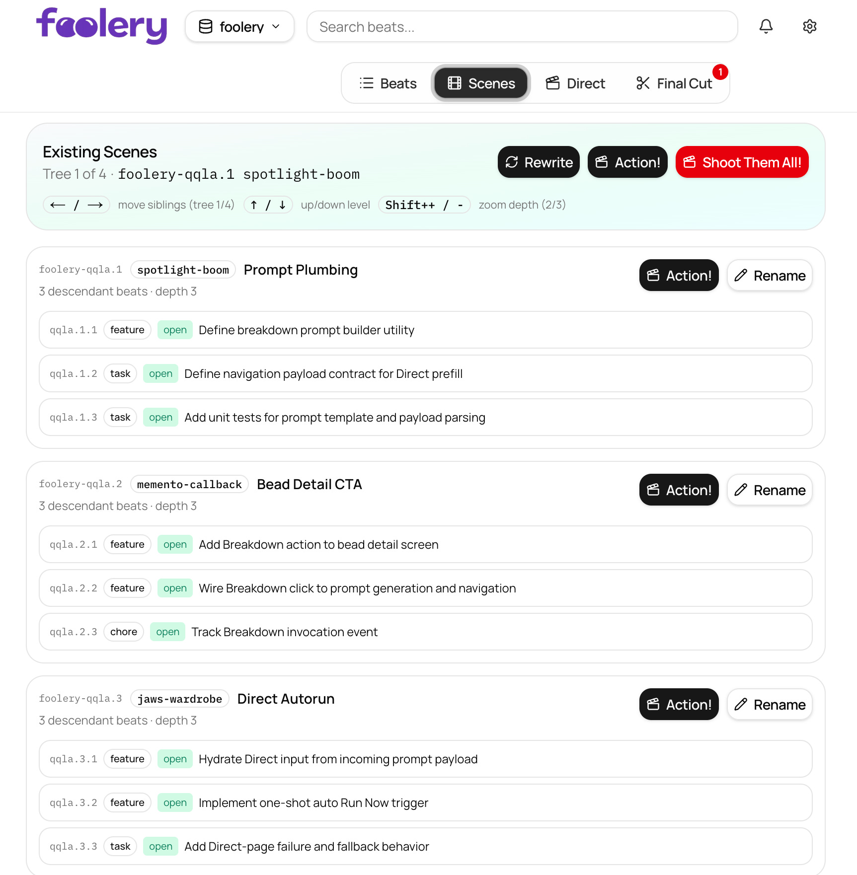 curl -fsSL https://raw.githubusercontent.com/acartine/foolery/main/scripts/install.sh | bashKeep it open while you use the coding agent of your choice. Discipline yourself to keep the agent focused, but blast all your harebrained ideas into Foolery. You’re gonna love it. And if not, well, it was fucking free.